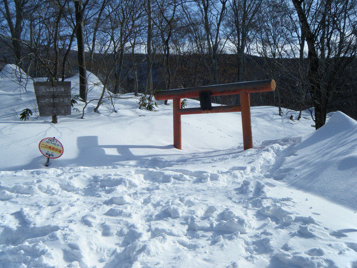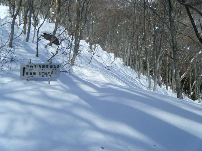 前日か当日かは判らないが、スノーモービルが入ったようで、踏み固められた雪道は全然沈まない。ろくな休憩も取らずに気持ちよく歩き通せたので、予定より早く一ノ滝神社の鳥居まで到着しここで小休止、見た感じ今年の山は雪が少ない気がした。少し上を眺めたら鈴木小屋のある三ノ俣のゲレンデは藪だらけ、里にはそこそこの降雪があったようだが、お山には降らなかったんだろうな、多分…