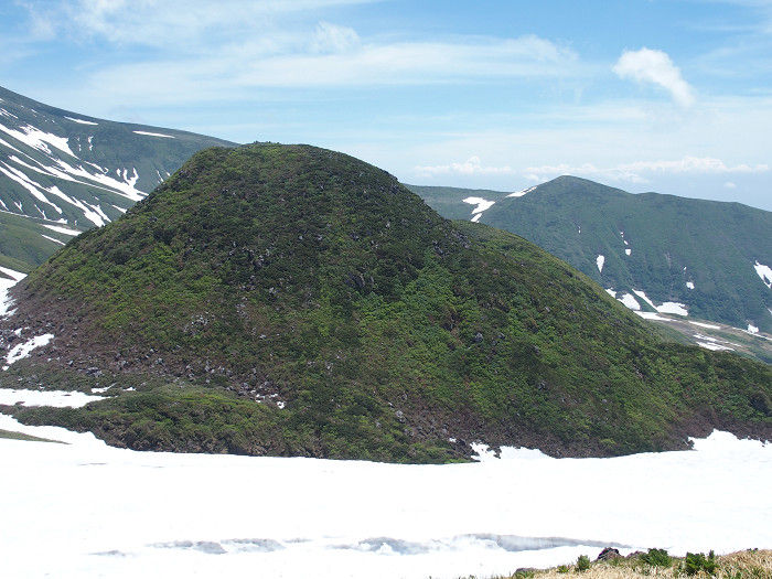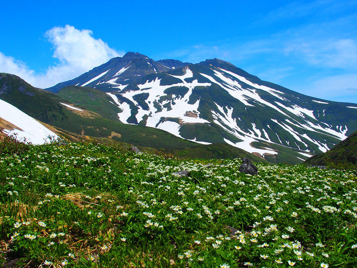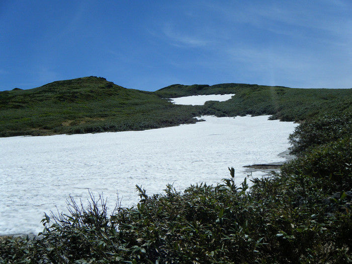 登り始めてすぐに、コイワカガミのピンク色とツマトリソウの白が、さらに登るとハクサンチドリの濃い紫色が点在し、シラネアオイの優雅な薄紫色に心がときめく。灌木帯の緑は濃くなり完全に夏山だが、高度を稼ぐごとに吹く風もさわやかになり、雪渓が現れる度に季節が逆行するように景色も変化する。