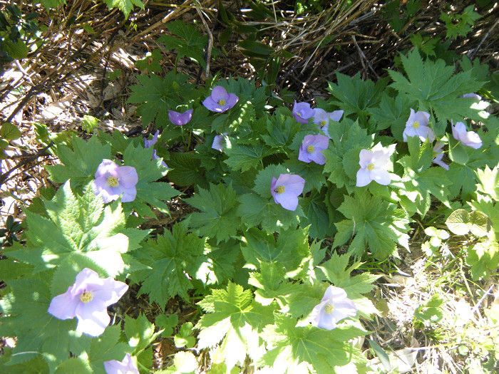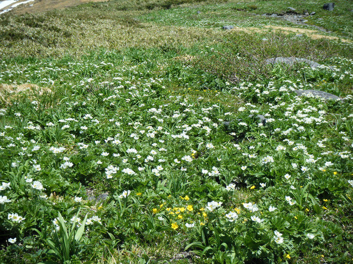 長い雪渓歩きに飽き長阪道と合流する頃には、目指すハクサンイチゲがさっそうと現れた。