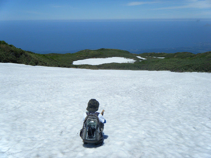 振り返ると眼下に日本海が広がり地球の丸さを実感する。