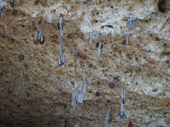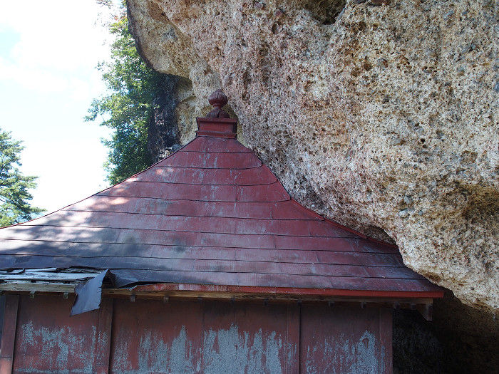 オーバーハングの奥に祠が建っている。