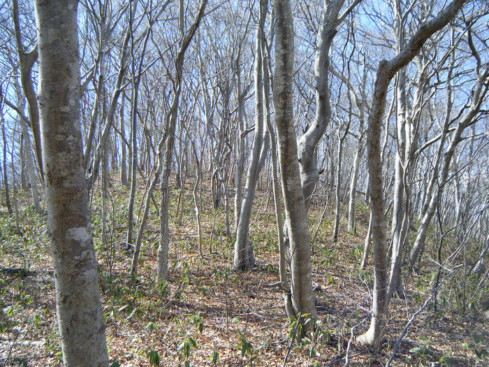 周回の広い道路から細い脇道が山腹に延びており、探検と称して斜路に取り付く。所々に春の息吹を愛でながら上を目指すと立派な遊歩道に出た。ガイドマップを持っていなかったので、コース名等はわからず進むと八森山への分岐となる。せっかくここまで登ったのだからと、もう少し進むと気持ちの良い雑木林となり歓声を上げる。見上げると青空の下に高舘山の鉄塔が見えた。この道は山頂に向かって延びているようなのでここで引き返す。