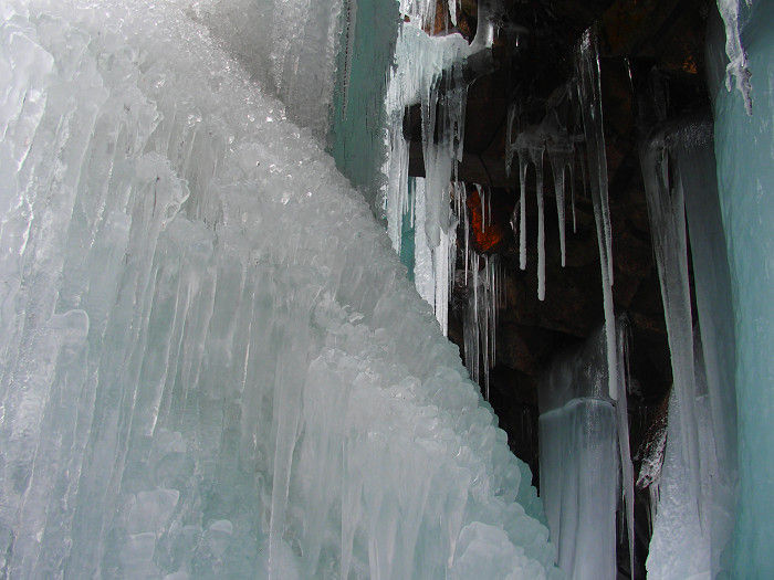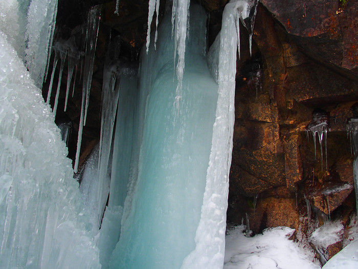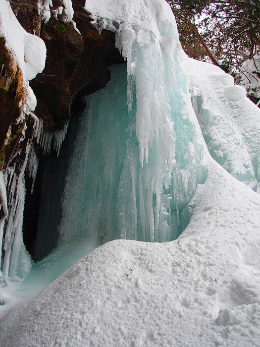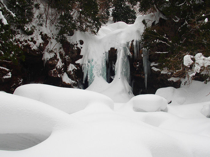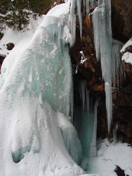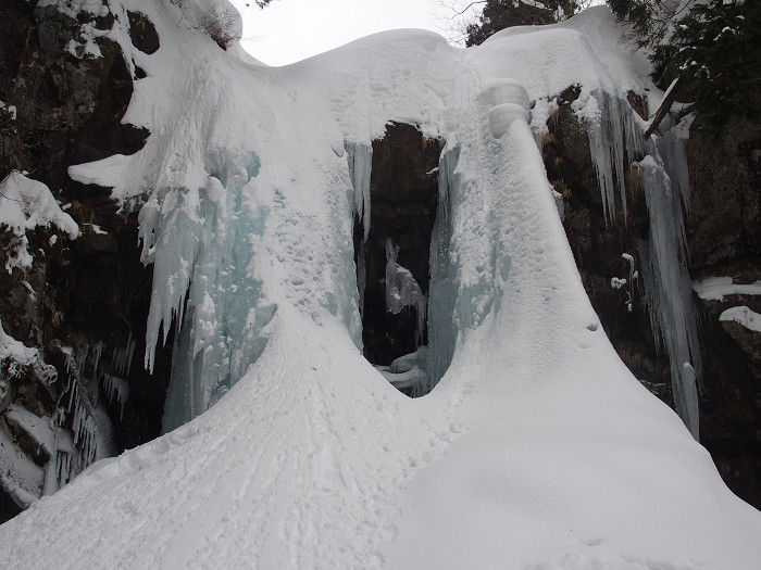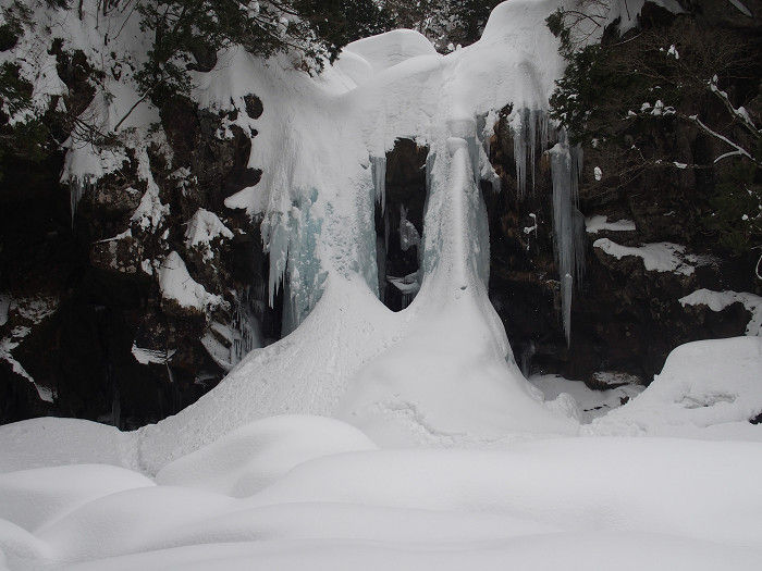 例年より雪が多いようで氷柱も埋もれた感じで短く感じた。しかしながら完璧に凍っており、滝の裏側にまで行けたのが嬉しかった。