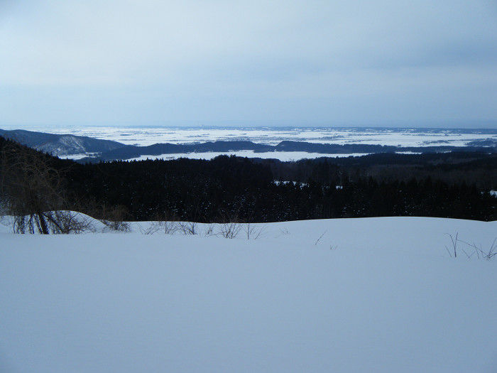 見晴台では雪に覆われた庄内平野の展望が素晴らしく歓声を上げて見入る。