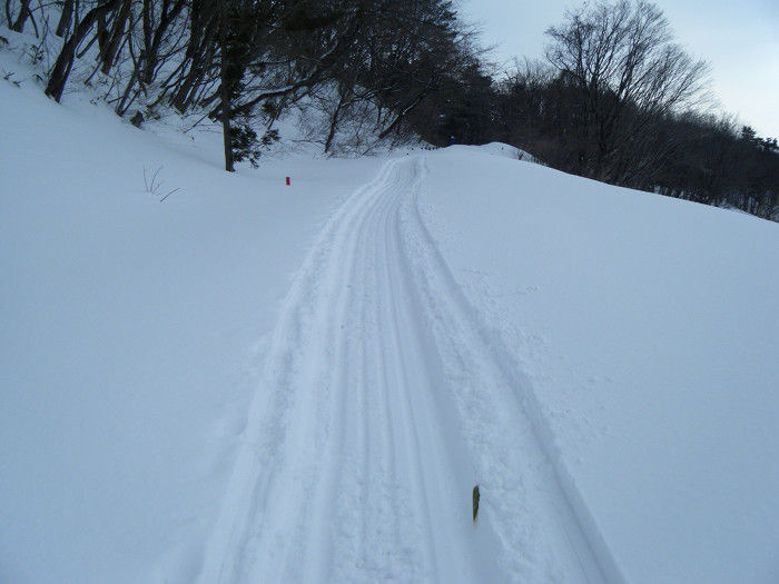 駐車場には先行車が2台いて1台は既に出発済み、もう1台はスノーモービルをトレーラーから荷下ろし中、その後スタッフの方達が大勢やってきて準備を始めた。我々は混乱を避けてそそくさと出発する。道は既に踏まれておりツボ足でOKであった。いつもの切り通しでは、曇天ながら笙ヶ岳と鍋森が向かえてくれた。