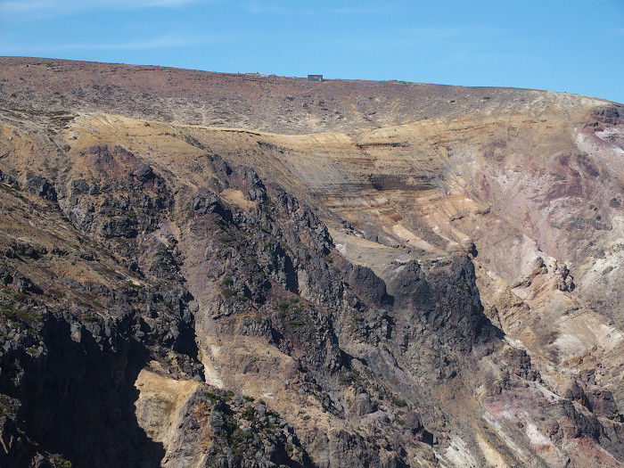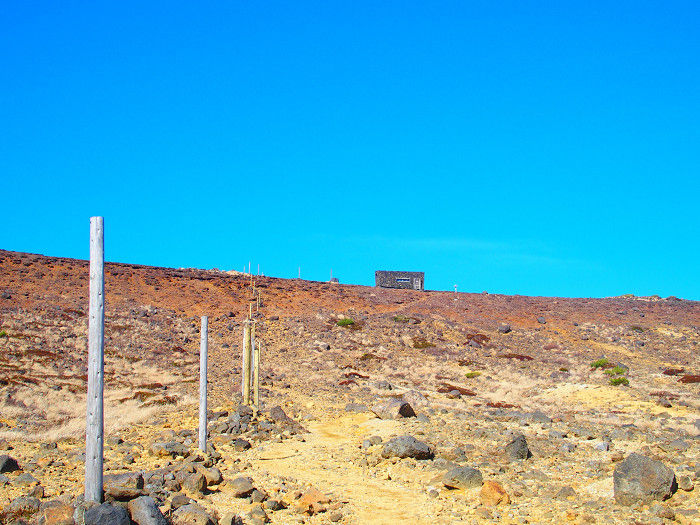 火口壁の上に避難小屋らしきものが見えた。