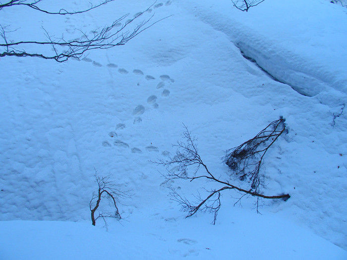 高度を稼ぐごとに段々視界も開け、周囲の山々が見えてくる頃には気温も上昇し、雪もかなり柔らかくなる。人の手が全く入らない原始の景観は、我々を決して退屈させないのだ。そして雪原には無数の野生動物の足跡が続いており、それが自然の豊かさを証明している。しかしそれは一つの谷を越えると突然見えなくなった。雪質も高度が上がったせいか硬く締まり、表面にはうっすらと新雪が降り積もっていた。