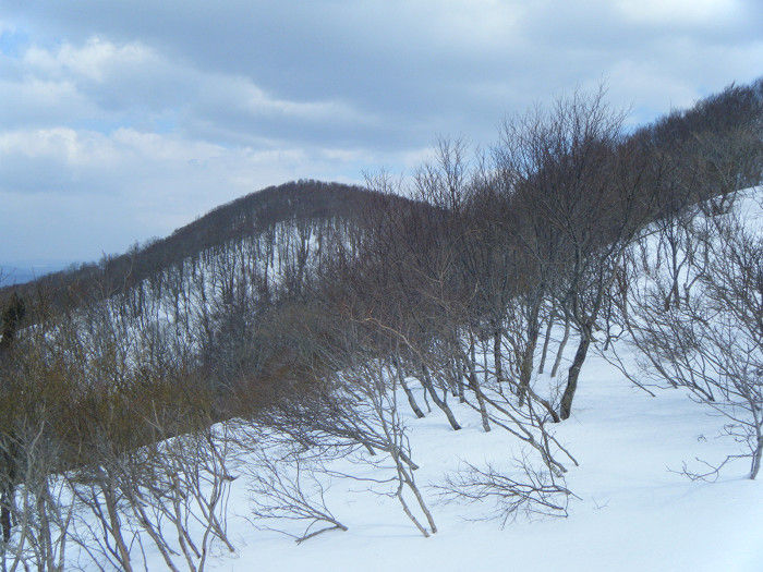 山中はブナと雑木の混生林から始まり、徐々にブナの植生が多くなる。しかし樹木は細く密度も濃い。故に見通しは利かずコンパス頼りの歩行となる。