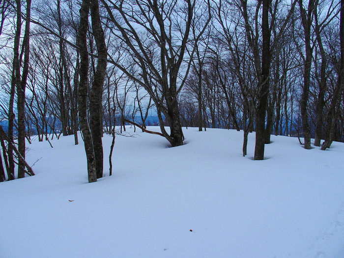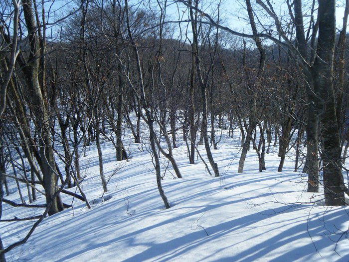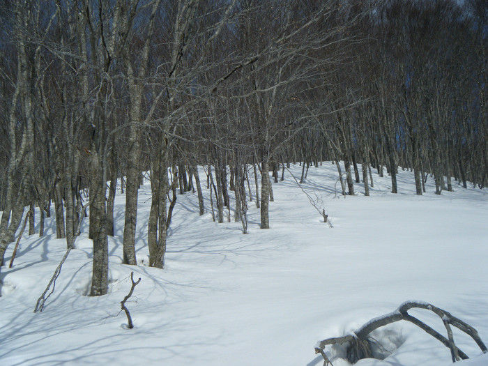 山頂直下の緩やかな斜面には、純白の雪面に適度な密度で並ぶブナが気持ちよく、歩を進めるだけでワクワクする。日頃のストレスを忘れるには雪山遊びは最高なのだ。