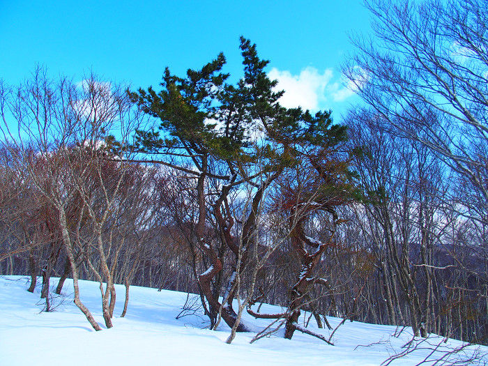 山頂付近まで来るとやっと北峰が姿を現した。ここは日本海からの季節風を遮る物が無いのだろう、松の枝が奇妙な形をしているのが印象に残った。