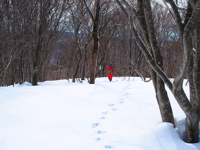 前日の好天による放射冷却で、この朝には相当気温が下がり残雪の表面は凍って硬い。体重の軽い相方はツボ足でも全くぬからなかったが、老年性体重過多の自分は早々にワッパを着用した。それでも時折ズボ抜けを繰り返し失笑を買う。