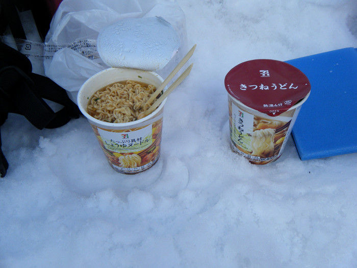 冷たい風を避けようと東側斜面を少し下ったところで昼食の準備をするが、山頂を乗越して吹く風はそんなに強くないがものすごく冷たく、すぐに身体が冷えてしまってゆっくり寛ぐことができなかった。冷え性の相方は我慢できずに飛ぶように下っていった。