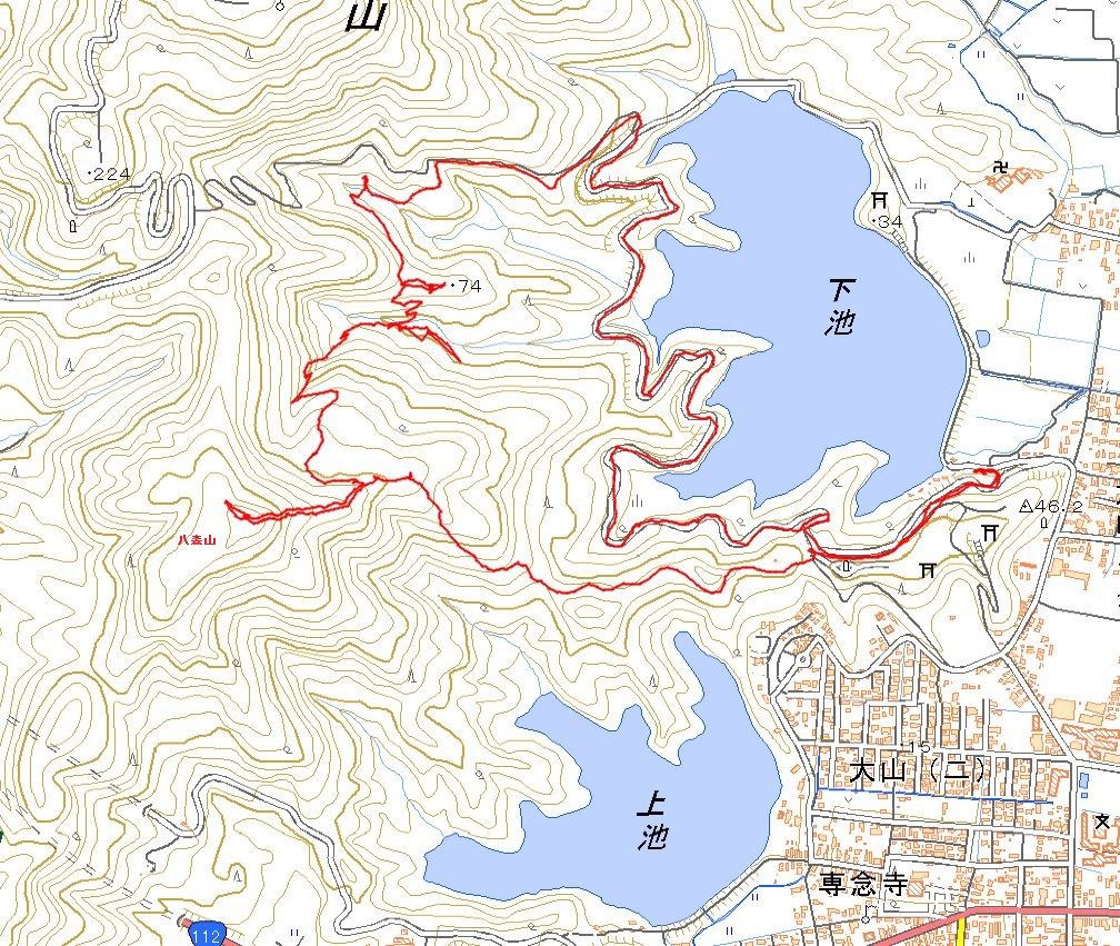 岩倉コースに突き当たったら池に下り、湖畔を周回する林道を辿り大山公園へ向かう。入り江の浅場では、産卵期に入った鯉たちがバシャバシャと水音を立てていた。後で考えたら、この道より下池の東側を通った方が、駐車場まで近いのだと分かったが…(汗)