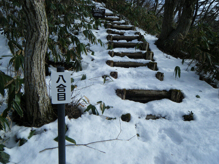 登山路沿いにいつの間に取り付けたのか○合目の表示板が出来ていた。よく見るとあちこち熊に囓られたような痕跡がある。残雪には昨日入ったと思われる単独行らしき踏み跡と、カモシカの足跡が転々と続いている。久々の山歩きのためかピッチも上がらず、相方とゆっくりゆっくり歩を進める。それでも根気よく歩いていると高度感が増してきた。