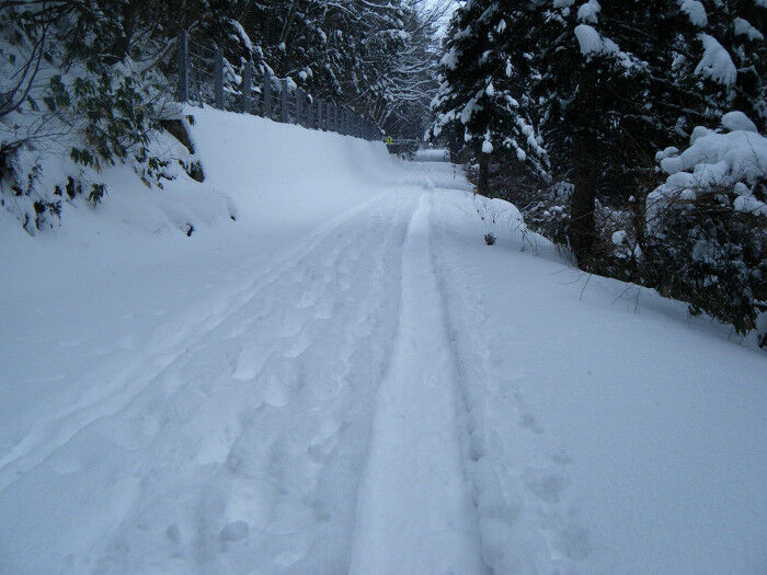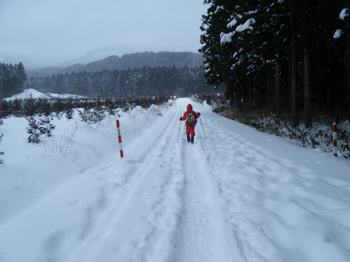 途中ショートカットして距離を稼ぎ、何の問題もなく一ノ滝駐車場まで辿り着く。道中の積雪はストックで計ったら60cm程かな?、周辺の藪も完全に埋まらず車道歩きに専念した。
