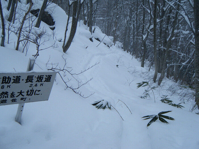 ここから道は二手に分かれる。一方は鳥居をくぐり一旦下る夏道のコース、もう一方はそのまま林道を詰めて終点より急斜面をトラバースするもの、もちろん例年通り後者を選んだ。嬉しいことにこの日は誰もここを歩いていない様子、しかし踏み跡は有り、ここもツボ足でOKだった。