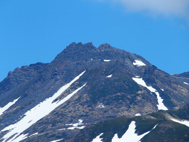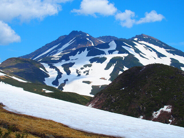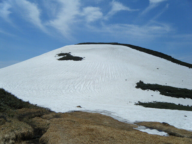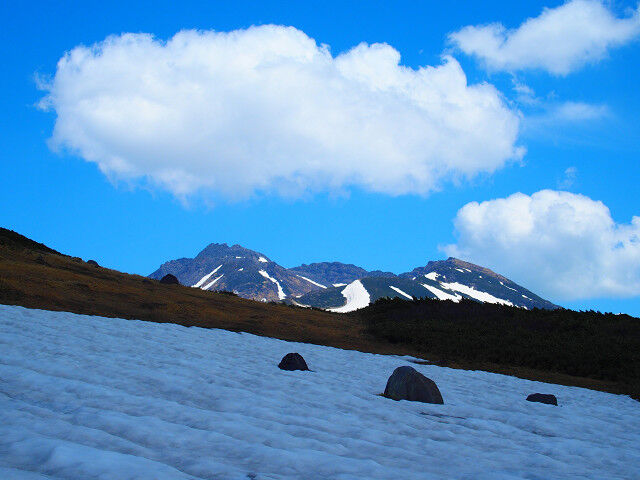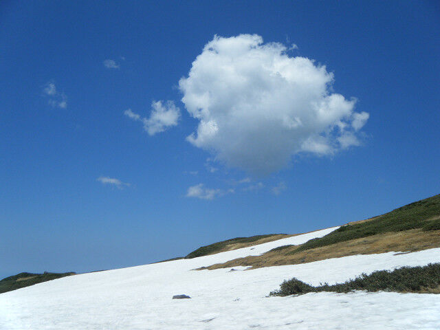 登りを再開すれば傾斜は緩む。そして残雪が現れた。照り返しが眩しいが涼しくて気持ちがよい。はるか前方に二人のスキーヤーが登っていくのが見えた。