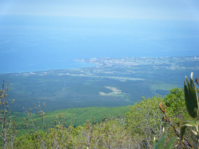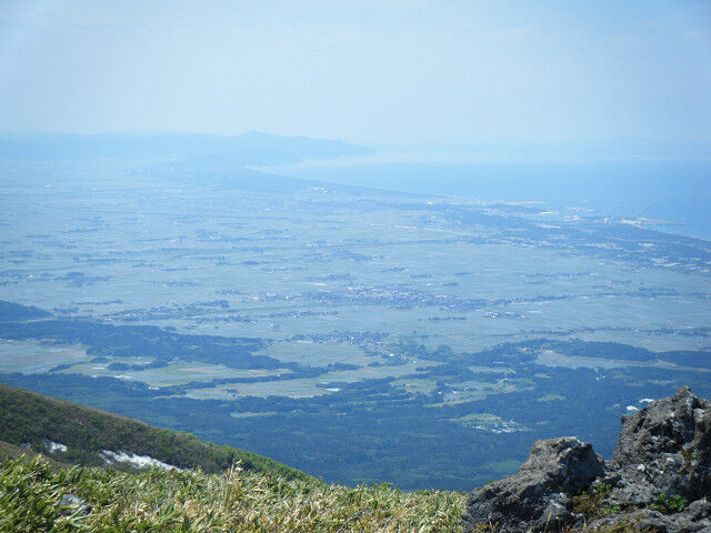 このコース最初の休憩点までが急だ。一汗掻いて休んでいると乾いた風が心地よく、火照った体を冷ましてくれる。ここまで上がると庄内平野がきれいに見渡せるが、残念ながらこの日は少し霞んでいた。
