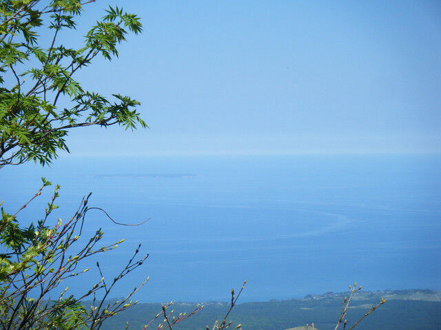 準備を整え階段を登り始めた。すぐに残雪に潰れた樹木が登山道を覆っている。エスケープするも踏み抜き等もあり嫌な感じ。高度が増すごとに徐々に視界も開けてくる。この日は日本海に浮かぶ飛島がやけに近く感じた。北には寒風山の姿、南には粟島がともに霞んで見えた。海は静かで潮目が緩やかな弧を描いて無数に広がっている。白い大きな船がポツンと浮かんでいた。