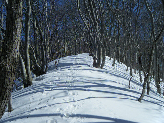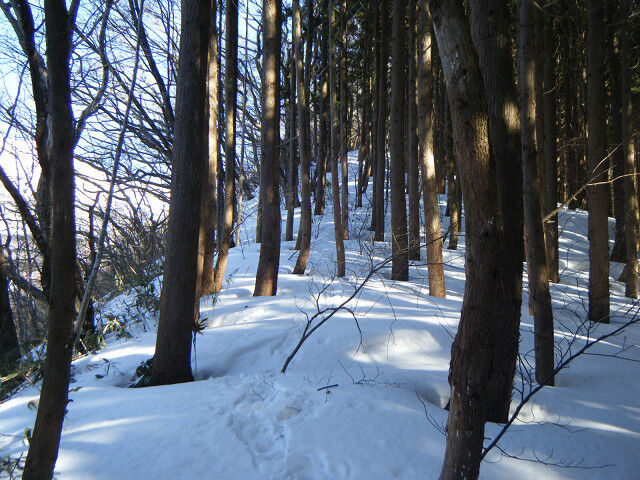 伐採業者の重機音が少し気になるが、穏やかに晴れ上がったこの日は春の陽気だ。雪も気温の上昇とともに緩みワカンを履いてはいるが、そんなにぬからず快適な歩行を楽しめた。下部は杉林の中なのでそんなに陽も当たらないが、上に行けば強烈な紫外線浴(大汗)が予想されたので、日焼け止めを丹念にすりこんだ。