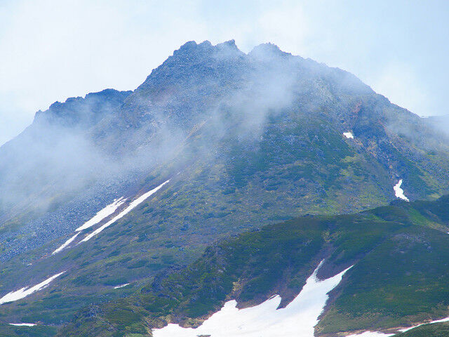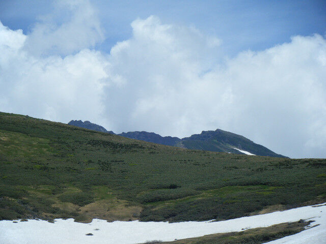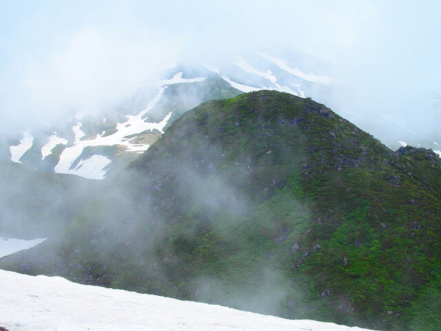 長坂道と合流すれば今日の行程は終了、だが目当ての花の字雪渓は雲に隠れて見えやしない。ちょうどお昼になったので、湯を沸かして昼食を取りながら、ゆっくり待つことにした。その後徐々に雲が切れ始めて視界が開けてきた。(冒頭の写真も)