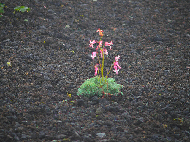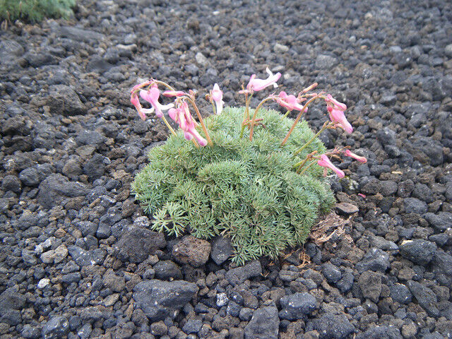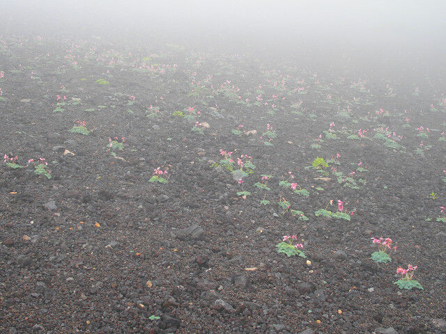 それにしても下山者のなんと多いことよ。大焼砂の分岐まで来たら、雨こそ降らないもののガスと風が強く、じっとしていると凍えそうなので相方は雨具を着用する。これは上に行ってもゆっくり休憩も出来そうにないので、ムーミン谷へ進路を変える。こっちは女岳と小岳に風が遮られて、ゆっくりできそうだ。暫く進むとコマクサの群落が素晴らしい場所に出た。