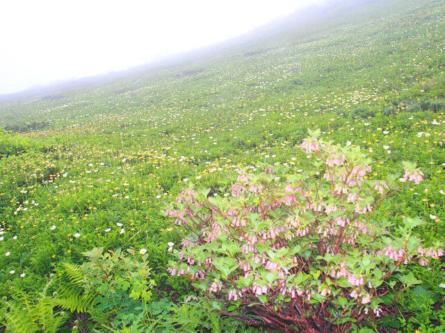 そのまま暫く進むと木道が現れ、多くの人たちが休憩していたので、我々も空き間を見つけ、お湯を沸かして定番メニューの昼食休憩とする。ふと見まわすとガスの中で結構いろんな花が咲いていた。忘れていた訳ではないが、この山は花の百名山なので、目当ての花を探して訪れる人も多いのだろう。