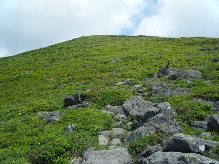 加齢と共に低くなる登行意欲と体力は仕方がない。ペースをゆっくりにして焦らず登るだけ、滝ノ小屋で一緒だった先行者がずいぶん先に見えた。ここは花の名所、見渡すとポツリポツリと咲き始めた花が、辛い登りを慰めてくれた。