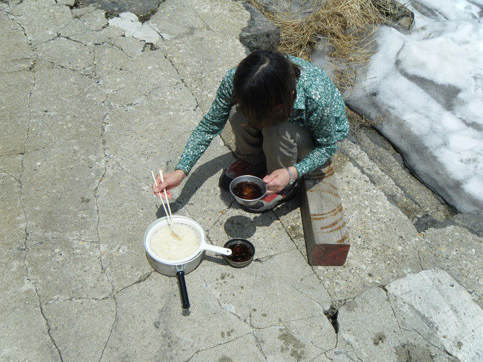 山頂方面は時折雲に隠れるが、思いの外クリアに見えた。そんなことはどうでも良いかの如く、急いで鍋に水を汲み、湯を沸かし、飲み物を残雪で急速冷凍する。何と言ってもこの日の目的は素麺パーティーなのだ。