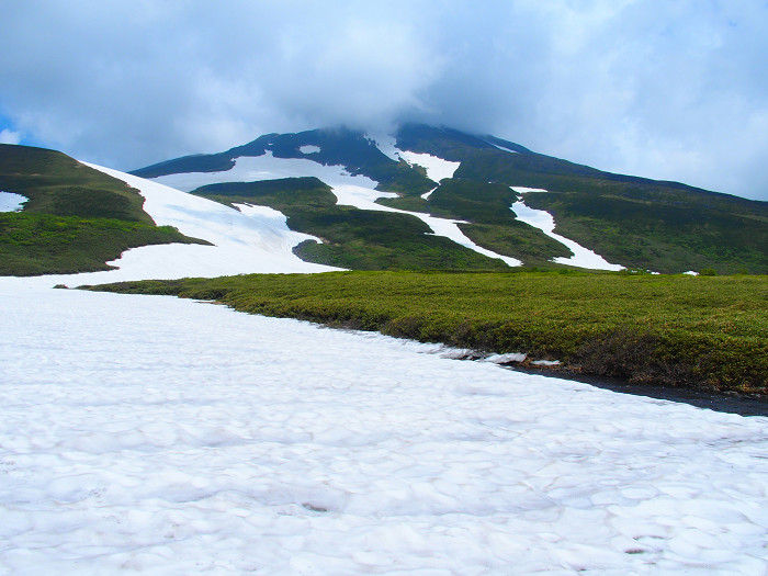 手早く準備を整えて、下の登山口から歩き出す。滝ノ小屋下で2名とスライド、相変わらず下界の景色は望めぬが、上の方ははっきりしてきた。雪渓を詰め登山道へ入ると遅咲きのシラネアオイが出迎えてくれた。久しぶりに八丁坂を見上げると、いっや~高い!