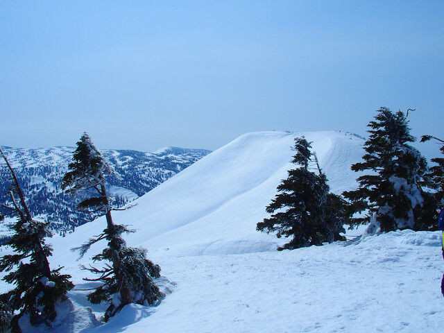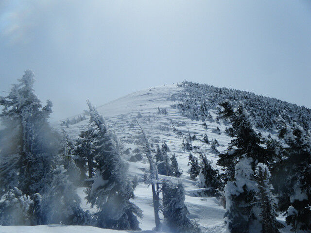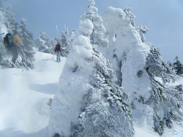 少しだけ残った樹氷群の間を縫って登行するのだが、冷たい風や氷化した雪面に少し難儀する。頂上付近は見事なシュカブラに覆われていて、風も強く後続を待つ間じっとしているのが辛い。吹っ飛ばされそうなので樹氷の陰に隠れた。でも視界はクリアーだからこれから滑る方向もきれいに見渡せた。