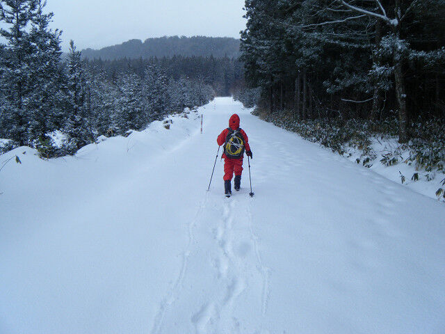 時折小雪が舞う空模様だが、雪山らしくていいねと相方も気分上々だ。順調に進むといつもはショートカットして車道を外れる場所なのだが、まるっきりの藪だ。諦めて車道をそのまま進む。