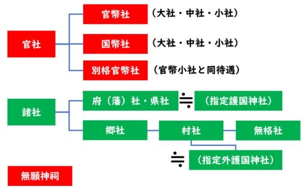 赤の官社と緑の諸社とその下の無願神祠(じんし?)の違いは、今で言う国家公務員と地方公務員、フリーランスみたいなものだそうです。まあお金の出何処の違いによるものと考えて差し支えないと思います。