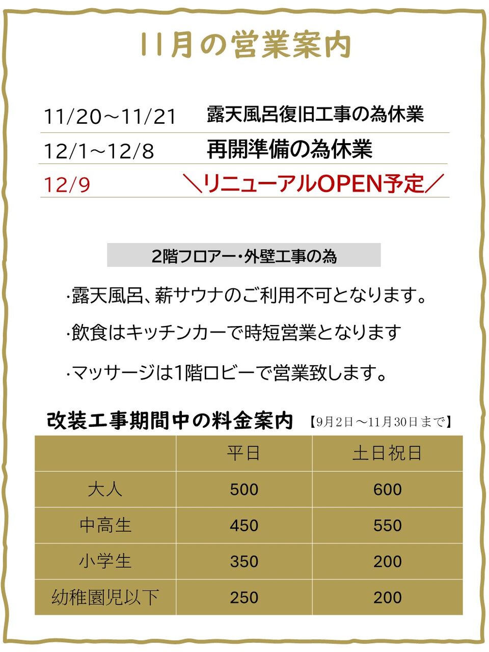 11月20日(木)〜11月21日(金) 露天風呂復旧工事の為休業