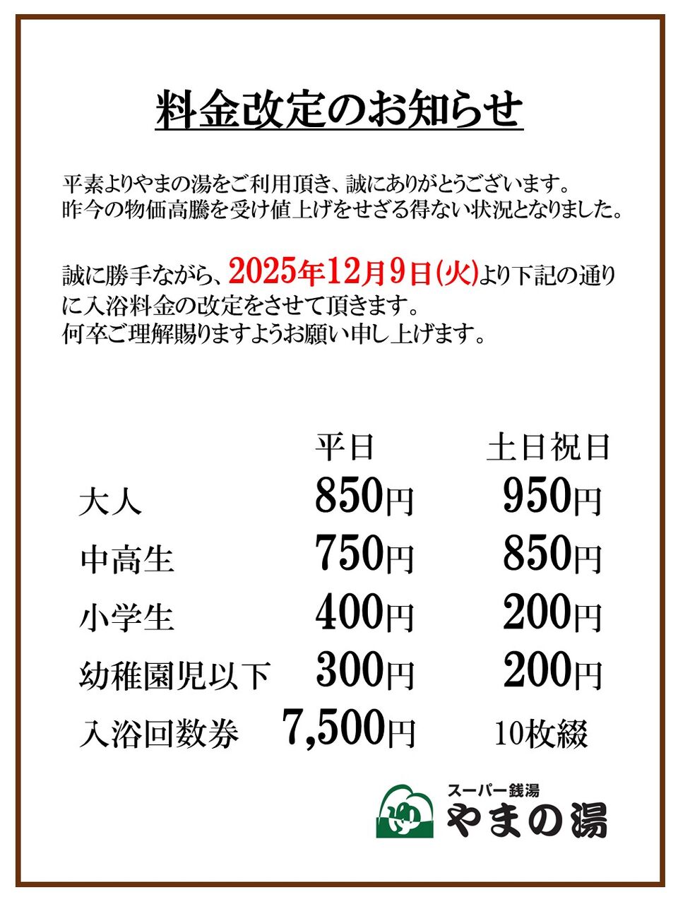 誠に勝手ながら、2025年12月9日(火)より下記の通りに入浴料金の改定をさせて頂きます。