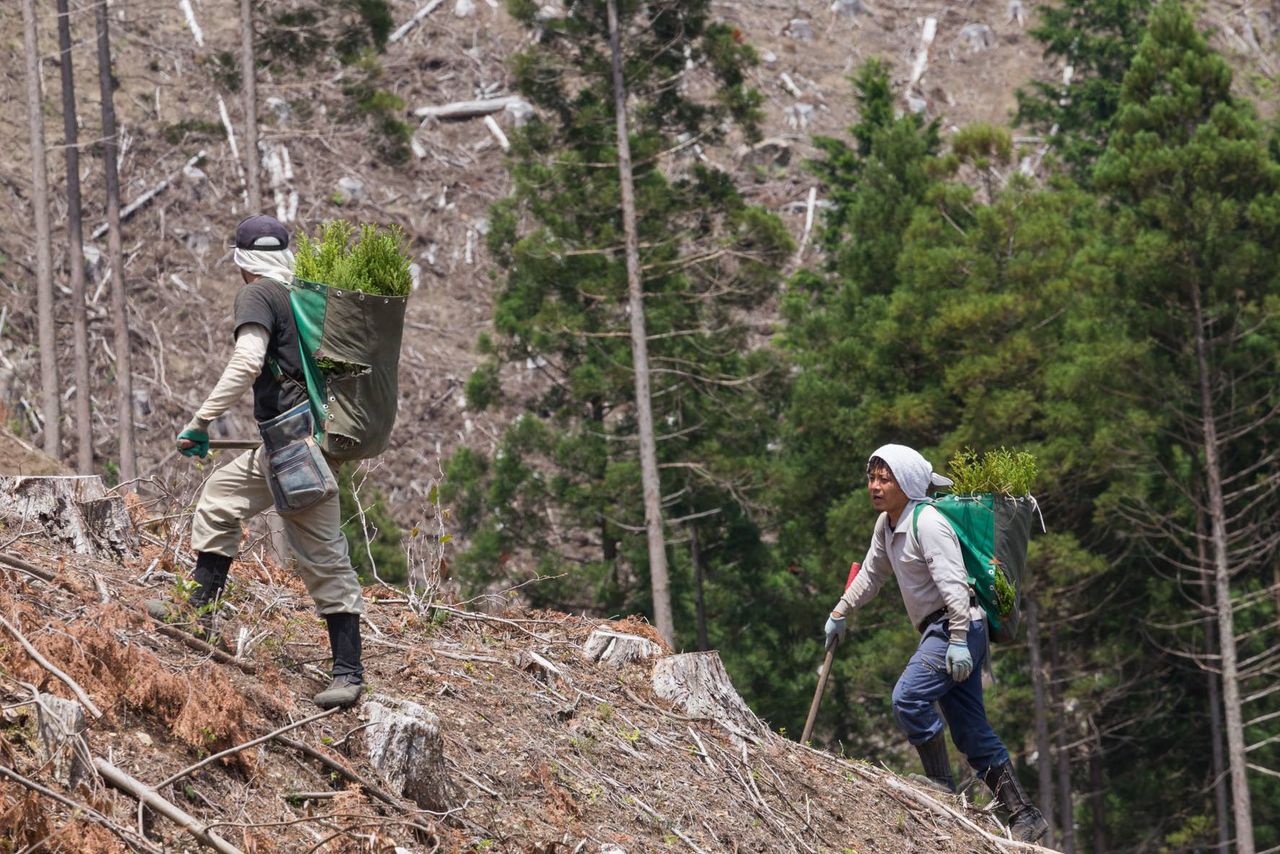 木を植えるのなんていまだにクワ1本で植えてますから。一日300~400本も山の急斜面で背負って、一本一本手植えする訳です。