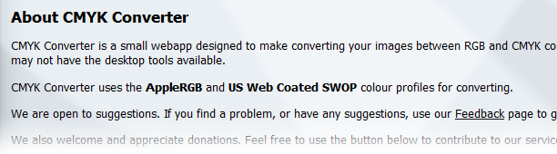 すでにウワサを耳にして、試してみようかな……と言う方もいるでしょうがちょっと待ってください。About CMYK Converterのページを見るとこう書かれています。