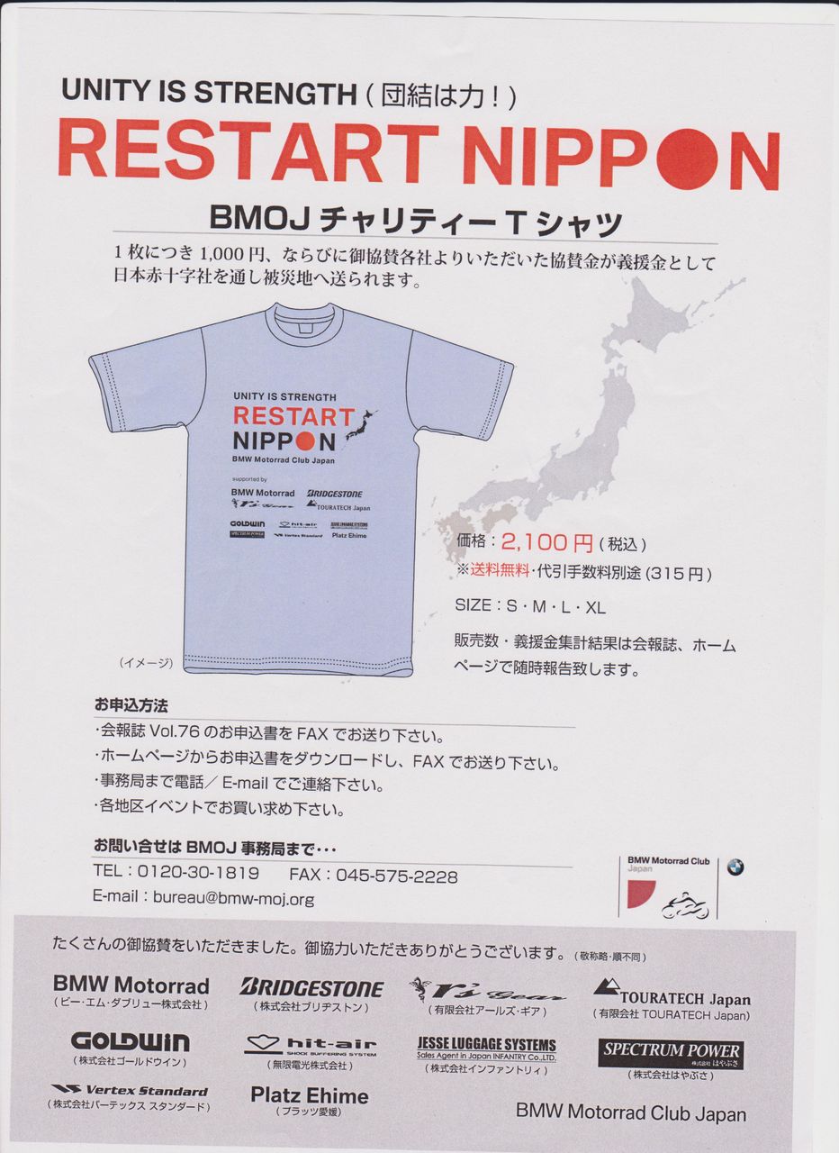 また、もしよろしければ、この写真のTシャツをご購入していただけませんでしょうか? なんでもないTシャツですが、価格のほぼ半分の1000円は、義援金として被災された方々にお渡しいたします。もちろん、BMOJの会員の方でしたら直接お申し込みいただいてもいいと思いますが、今回この私のブログを見ていただいている方々のパワーを少しでも被災者の方に届けたいと思い、このちっちゃな企画をしたいと考えました。もし、ご賛同いただける方は、下記に記しました私のメールアドレスに、お名前、ご住所、Tシャツ何枚と記入して、お申し込みください。送料は、1枚でも10枚でも無料です。私が責任を持ってお送りいたしますし、どのくらいの義援金となったのかもお知らせいたします。自分ではなんにもできないけれど、なにかしたいと考えている方は、ぜひこのTシャツを購入して、被災された方々を勇気付けたいと思います。