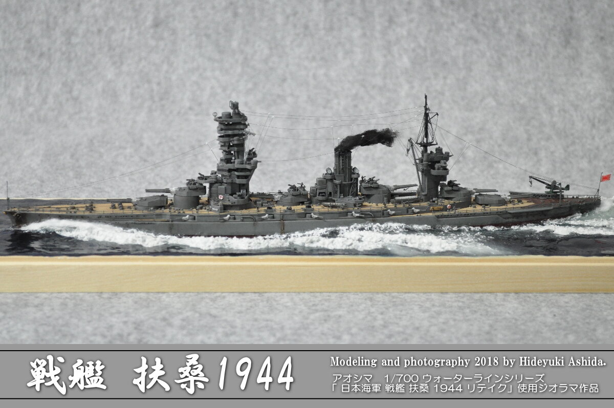 このモデルはフルハル(船底も再現された)キットなのですが、切り取ってウォーターラインモデルに改造され、エッチングパーツは使用せずに、プラ素材で自作のパーツにてディテールアップされ、無塗装完成作品として素晴らしいもので、是非展示してほしいとお願いしましたところ、快く引き受けてくれました。