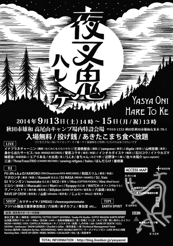 秋田県内の様々なアーティストが力を合わせ、自然と人と音楽の調和を願うと共に、無念の死を遂げた鬼神・夜叉鬼の鎮魂祭の意も込めて、秋田市雄和の大自然の中にある「高尾山キャンプ場」で年に一度の祭典として『夜叉鬼祭』を開催しております。