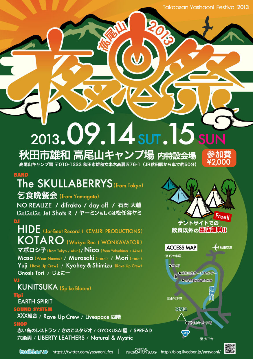 秋田県内の様々なアーティストが力を合わせ、自然と人と音楽の調和を願い、秋田市雄和の大自然の中にある「高尾山キャンプ場」で年に一度の祭典として『夜叉鬼祭』を開催しております。