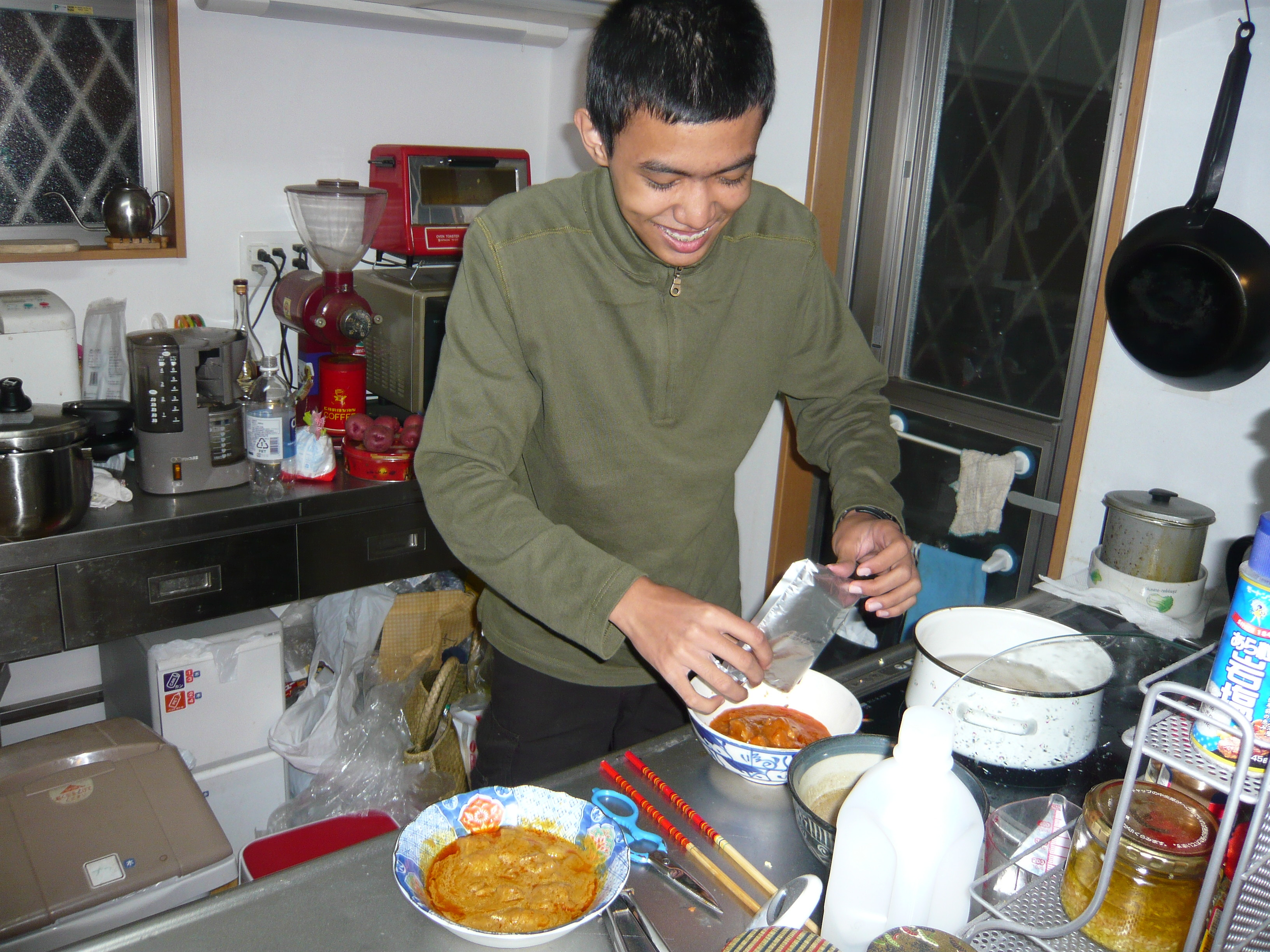 たくさんのヒッポメンバーもお友達が集まって25日は我が家でトゥリマカシーPARTY。シャメルとマレーシアのムニャニやムナリをやったり、シャメルを中心にしながらみんなの気持ちがひとつになれるような会でバグース!そこで驚きの発見。なんとシャメルは豚以外の肉は食べられる!!シャメルはイスラム教だから豚肉とお酒がダメ。豚以外も、マレーシアみたいにお祈りをしていないから食べられないと思っていたんだ。調査票にも×all meetって書いてあったし。シャメルがとーまちゃんが作ったチキンの料理を食べようとするから「ダギン(肉)、ダギン」と言ったら、シャメルは「ボレボレ」っていうからびっくりモスリムも2タイプあって、ハラル(祈り)していない肉は全部ダメという人と、ダメじゃない人がいて、自分はだいじょうぶだって言うんだもん。もー!帰る前の日じゃな〜い。肉断ちの1週間、たんぱく質は卵と魚とイカ。毎日何かしらイカ料理。イカのお好み焼き、イカ入り八宝菜、イカ大根、天ぷらなどなど。おかしいな〜。初日に聞いたはずなんだけど〜。