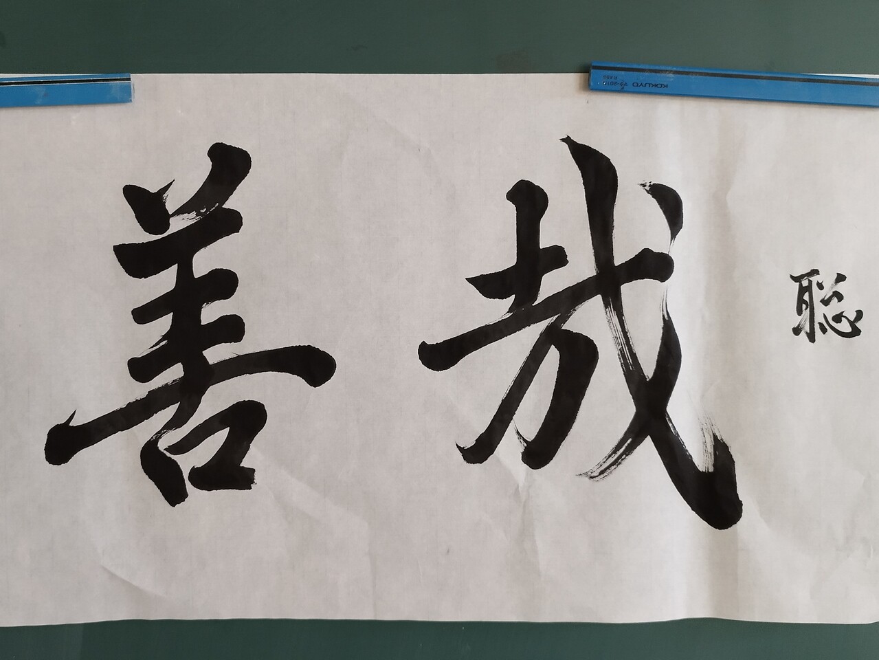 口頭で「よろしい!」というような感じで、そのへんの筆でさっと書く。草書だと読めなくなってしまうからここは行書で。そんなイメージがわいたので、特に行書が得意というわけじゃないけど、僭越ながら僕が書くことにした。実際書いてみると、まとめやすく書いていてなかなか気持ちいい。