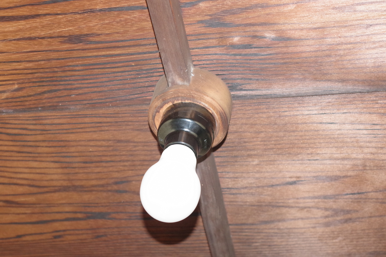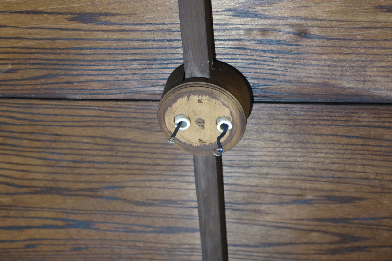 この時代はまだケーブルを使っていません。写真に見えている白い管は碍子(がいし)の一種で碍管といいます。この2本の碍管の幅がランプレセプタクルの穴の幅と全く同じになっていて、うまくはまるようにできています。おそらく決まった幅があるのでしょう。