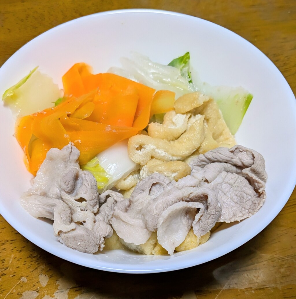 白菜、ぶなしめじ、揚げ、椎茸、ピーラーてスライスした人参、豚肉。