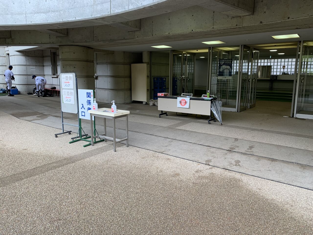 秋季大会も夏の交流大会に引き続き、感染予防として大会本部入口での体温測定と所属・氏名の記入、球場内でのアルコール消毒薬の配置が行われておりました。