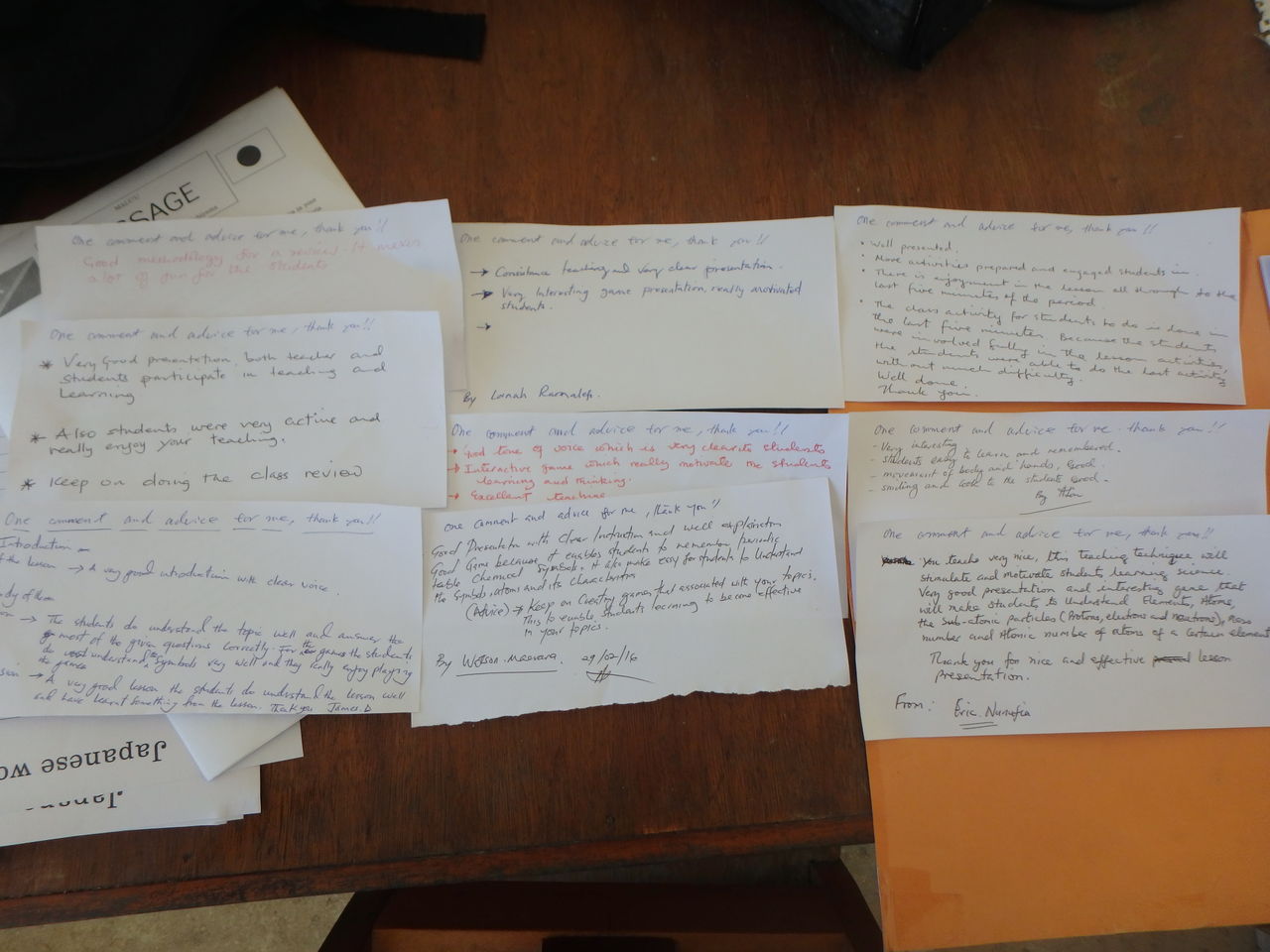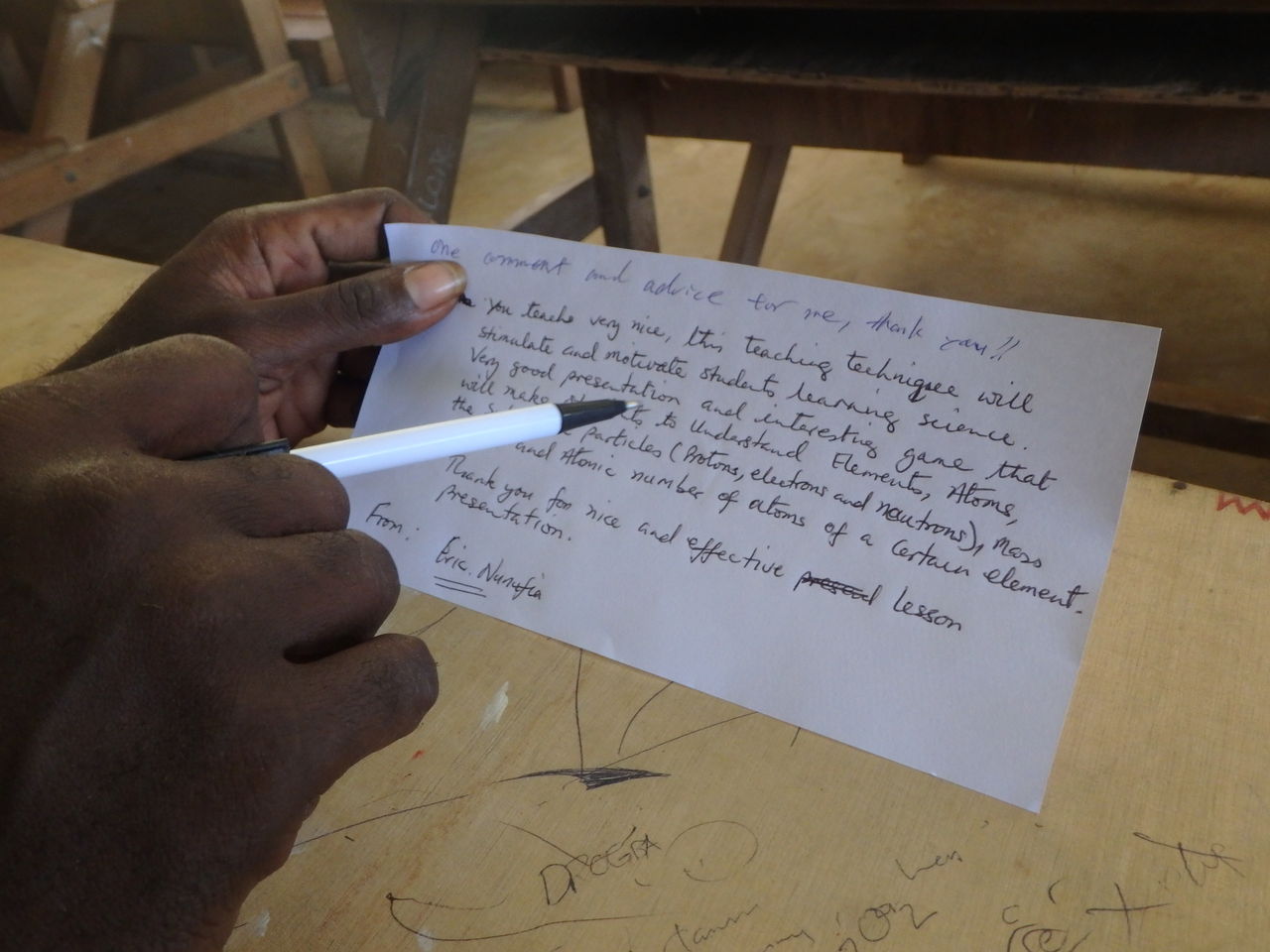 11時40分から始まる、フォーム4(高校1年生)の45分間の理科の授業に、その時間空きの先生方に来ていただき、コメントシート(A4の3分の1程度の紙)に感想とアドバイスを書いていただくというものです。