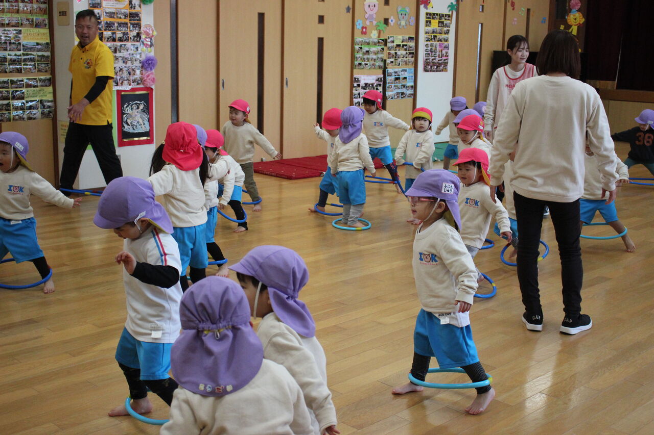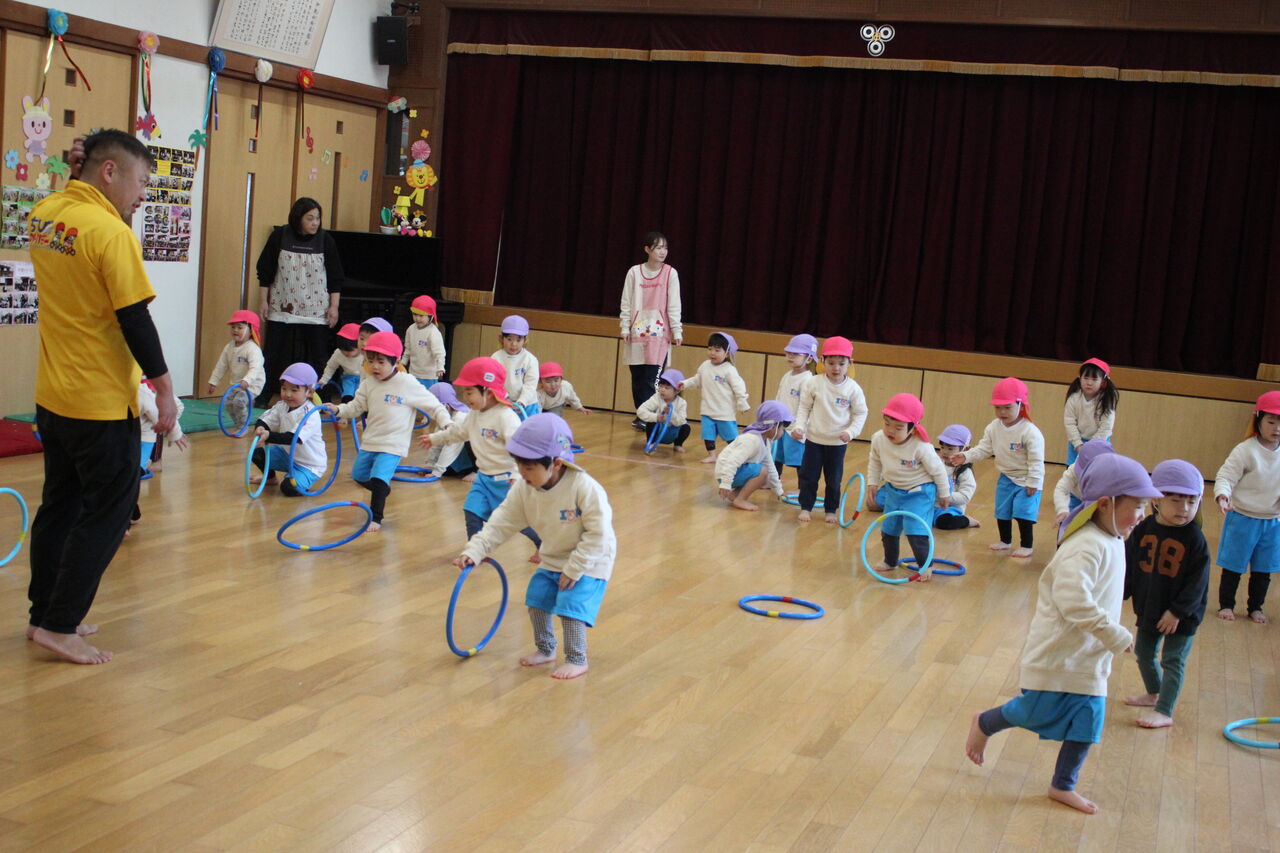 2歳では、わっかが中心でしたが、転がしたわっかを追いかけて取りに行く事とか、座って体を動かす運動など、びっくりするぐらい頑張る姿がみられました。今日はありませんでしたが、2歳児は、ストライダーも上手に乗りこなすことができるようになっています。来年もノリダー教室は続けます。