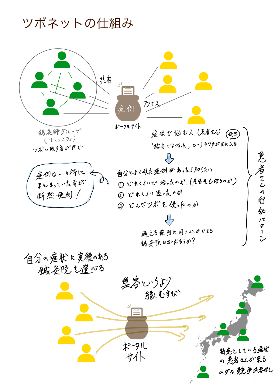 ツボネットは「症例が検索できるツボ辞典」というポータルサイトで、9月にプレリリースを予定しています。鍼灸師から症例を集め、それを一般公開します。