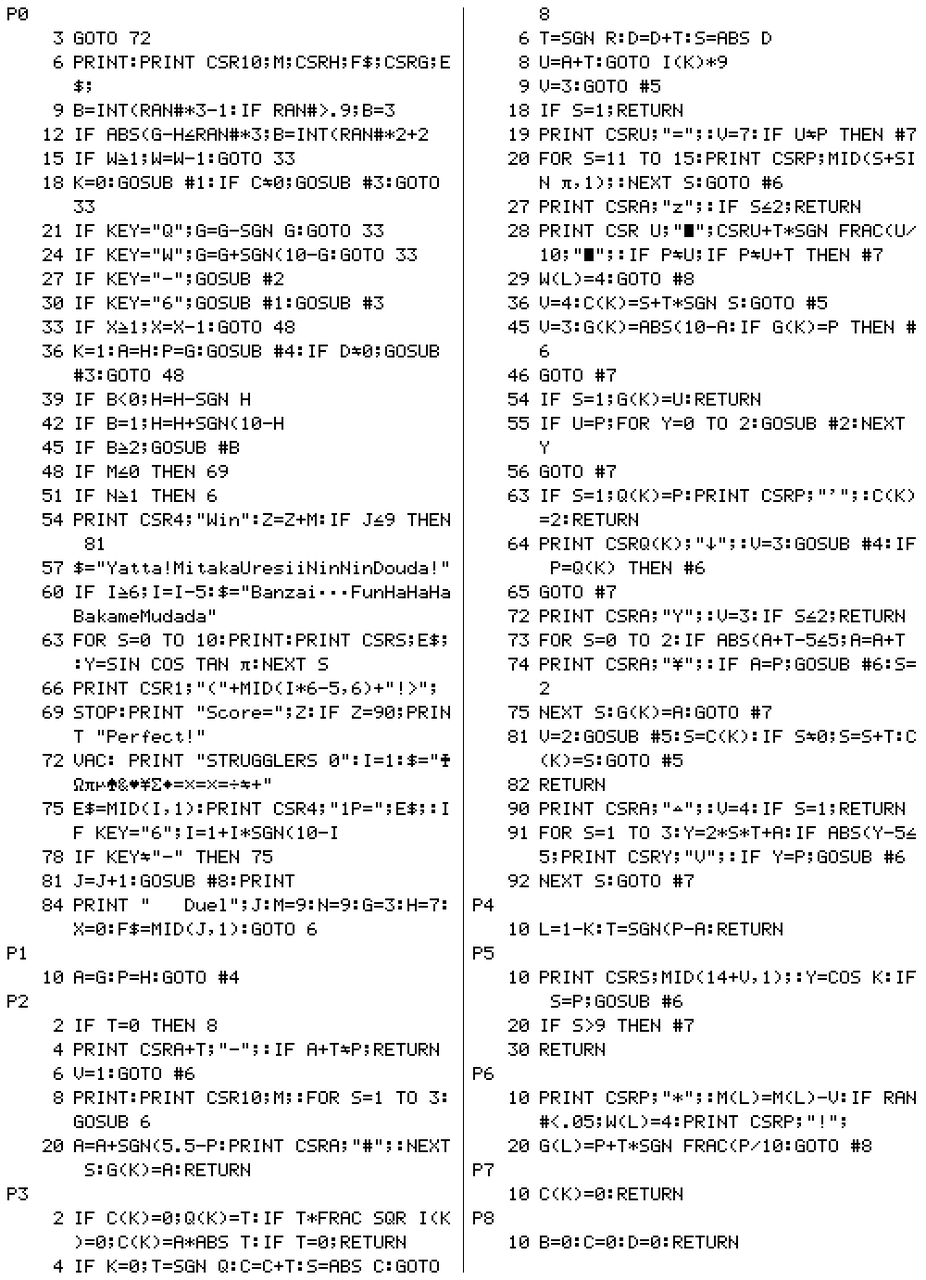 ポケコンジャーナル1993年9月号の「STRUGGLERS」、マイコンBASICマガジン1994年1月号の「STRUGGLERSsp」、これら2作のPB-100対応改良版が本作です。